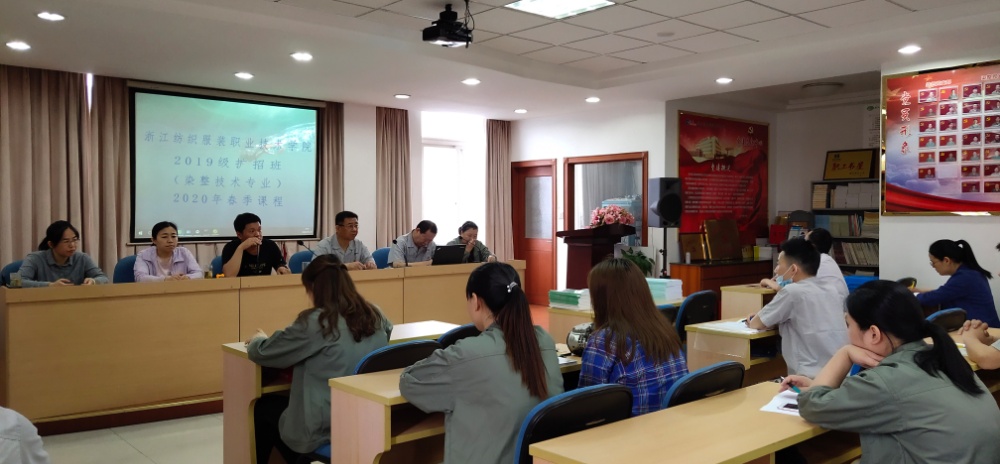 5月30日上午,,,,,,,浙江纺织服装职业技术学院2019级扩招班(染整技术专业)2020年春季课程正式开课了。。。。。在课前,,,,,,,公司13名学员在班主任蒋老师的带领下在课前进行了简单的开课仪式,,,,,,,公司董事长兼总经理莫炳荣、副总莫荣明、总工施道妃工出席了仪式。。。。。