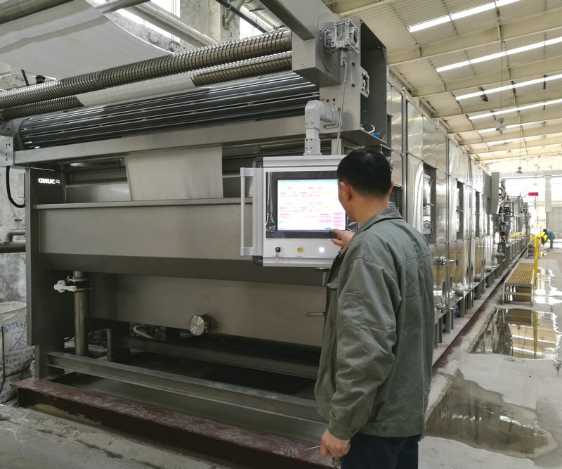 平幅煮漂机是低张力、高水洗效能的自动化针织棉前处理设备,,,,,煮漂机的主要作用就是去除纤维上的蜡质、果胶物质、色素以及矿物质等杂质,,,,,为后一道的染色过程提供需要的白度与毛效,,,,,以便达到染料上色的基础。。。。。。。。改变了传统的在染缸做前处理,,,,,之后再在染缸中完成染色过程、后水洗、固色等多道工序的加工工艺,,,,,有利于提高产品质量,,,,,节约能耗。。。。。。。。