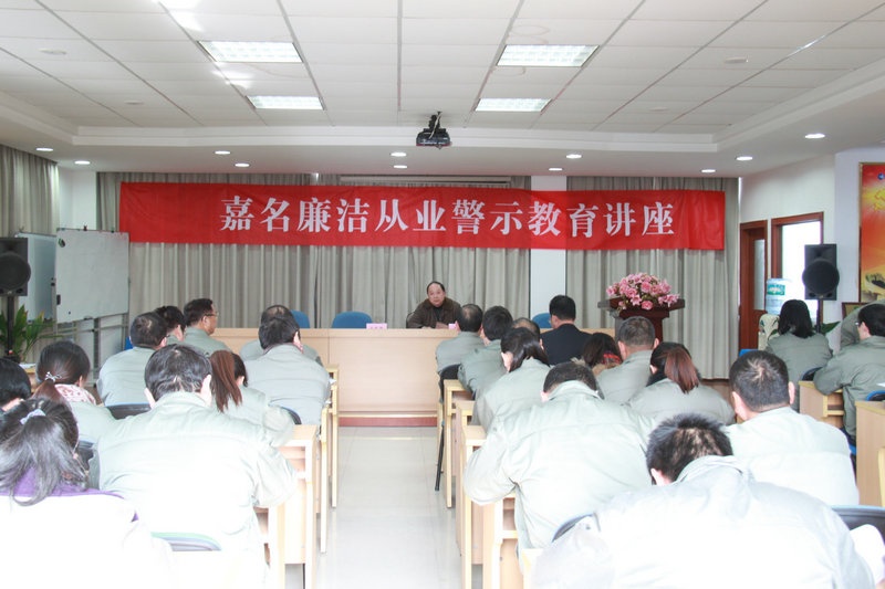为加强经营管理人员的从业廉洁教育,,,,,,,促进公司上下认清形势、提高认识、遵章守纪、廉洁从业,,,,,,,12月26日下午,,,,,,,公司举办廉洁从业警示教育专题讲座。。。。。。公司领导,,,,,,,各部门、各事业部负责人,,,,,,,全体营销经理、外协人员,,,,,,,部分仓管员等50多人听取讲座。。。。。。讲座邀请桐乡市检察院原党组成员、副检察长沈俊夫就非公企业职务经济犯罪的预防进行了深入讲解,,,,,,,讲座还宣贯了《公司员工廉洁从业规定》,,,,,,,公司莫总讲了话。。。。。。