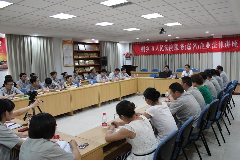 7月27日(周六)下午,,,,,,,应公司邀请,,,,,,,桐乡市人民法院走进437必赢公司为企业提供法律服务,,,,,,,在公司行政楼三楼多功能厅,,,,,,,举办了一次法律专题讲座。。。。 。公司领导、营销中心各部门全体人员,,,,,,,财务管理部、信用管理部、品质管理部、采购物控部、经编事业部的营销、生产、财务负责人等30余人参加了会议。。。。 。